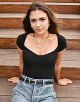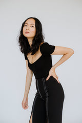 Searching for your wardrobe staple? Look no further. This ribbed cotton black tee bodysuit can transform from day to night by adjusting the sleeves from upright to off the shoulder. You know we can't resist a two for one piece...